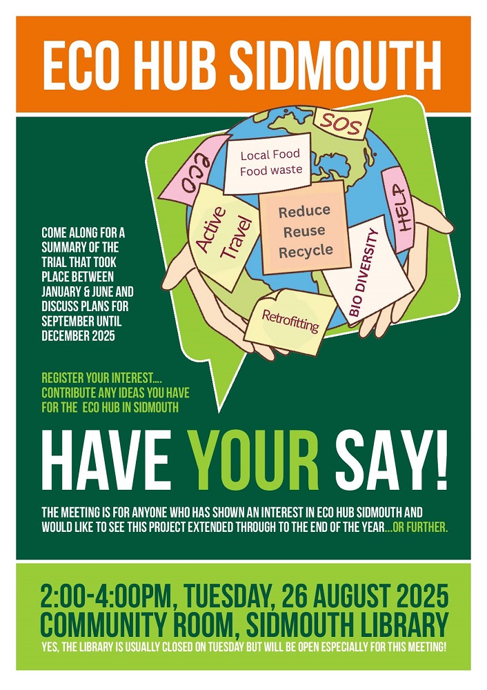 Would you like to engage with what the Sidmouth Eco Hub is up to?! Would you like to come along to a meeting in the library on Tuesday, 26th August between 2pm and 4pm? Anyone interested in learning about or contributing to the Eco Hub Sidmouth in the future can pop along to find out!